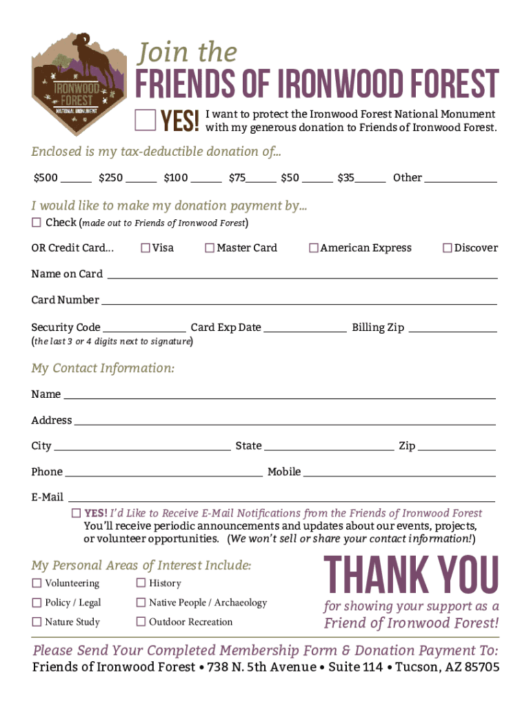 Join befriends OF IRONWOOD FOREST YES! I want to protect the Ironwood Forest National Monument with my generous donation to Friends of Ironwood Forest. Enclosed is my tax-deductible donation of...