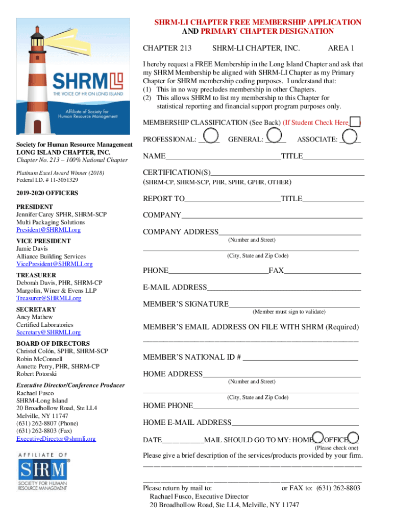 CHAPTER 213SHRMLI CHAPTER, INC.AREA 1I hereby request a FREE Membership in the Long Island Chapter and ask that
