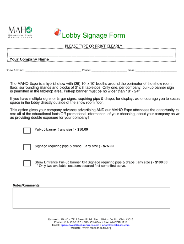 Lobby Signage Form PLEASE TYPE OR PRINT CLEARLY Your Company Name Show Contact: Phone: Email: The MAO Expo is a hybrid show with (29) 10 × 10 booths around the perimeter of the show room floor, surrounding