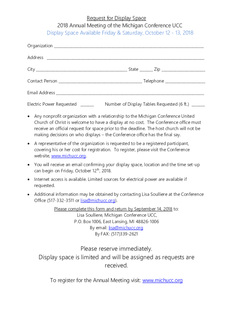 Request for Display Space 2018 Annual Meeting of the Michigan Conference UCC Display Space Available Friday & Saturday, October 12 13, 2018 Organization Address City State Zip Contact Person Telephone