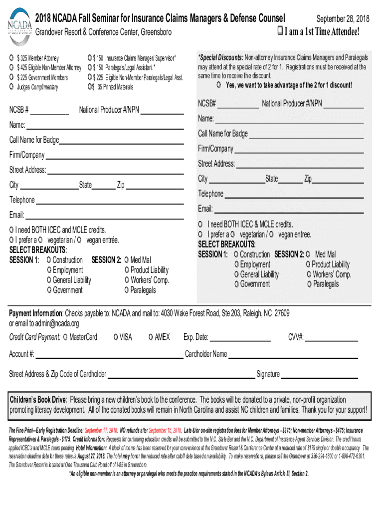 2018 NCAA Fall Seminar for Insurance Claims Managers & Defense Counsel September 28, 2018, Grand over Resort & Conference Center, Greensboro I am a 1st Time Attendee! $325 Member Attorney $425 Eligible
