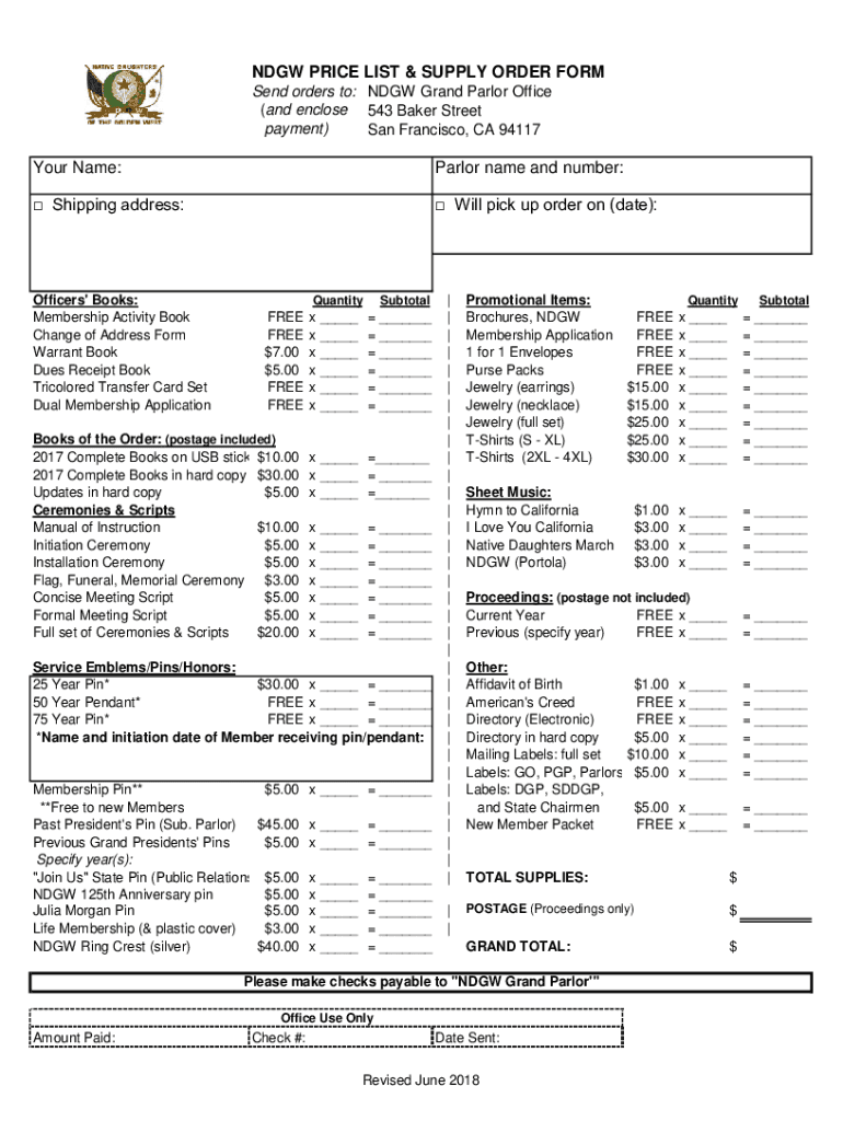 NEW PRICE LIST & SUPPLY ORDER FORM Send orders to: NEW Grand Parlor Office (and enclose 543 Baker Street payment) San Francisco, CA 94117Your Name:Parlor name and number: Shipping address: Will pick