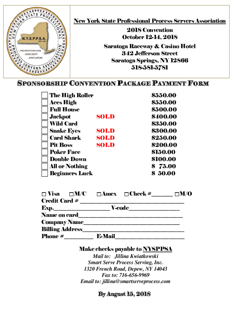 New York State Professional Process Servers Association 2018 Convention October 1214, 2018 Saratoga Raceway & Casino Hotel 342 Jefferson Street Saratoga Springs, NY 12866 5185815781SPONSORSHIP CONVENTION