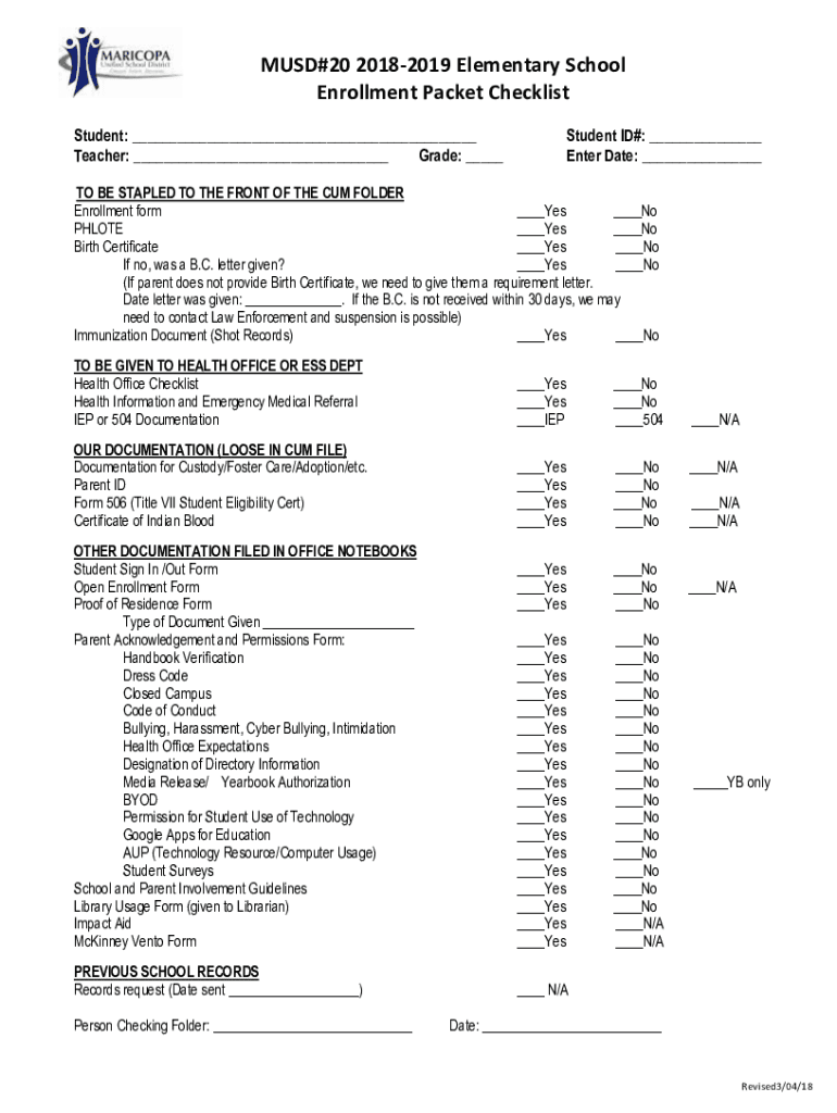 MUST#20 20182019 Elementary School Enrollment Packet Checklist Students: Teacher: Grade: Student ID#: Enter Date: TO BE STAPLED TO THE FRONT OF THE Come FOLDER Enrollment form Yes No PHOTO Yes No