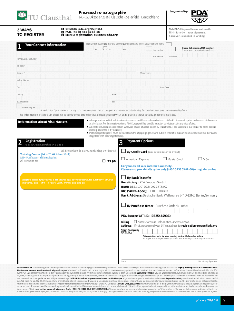 ProzesschromatographieSupported by14.17. October 2018 ClausthalZellerfeld Deutschland3 WAYS TO REGISTER11 ONLINE: pda.org/EU/PC18 2 Faxes: +49 30 436 55 0866 3 EMAIL: registrationeurope PDA.your Contact