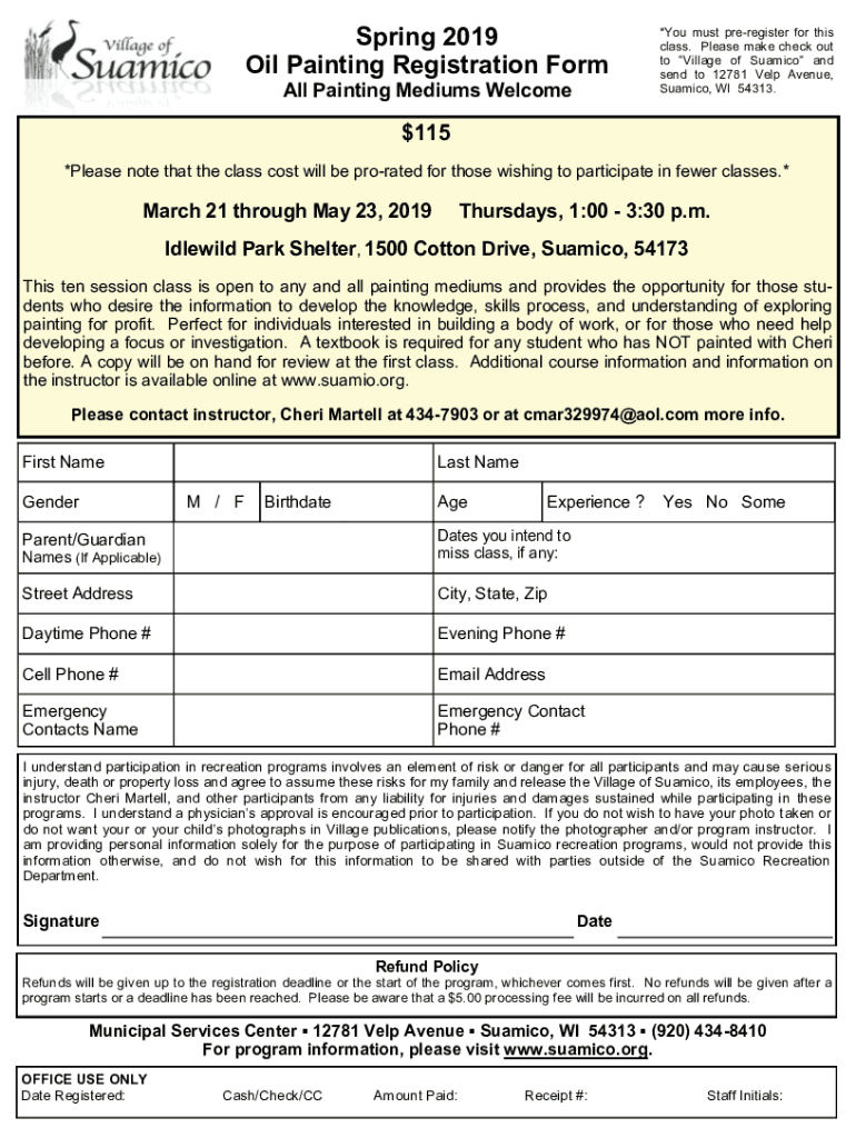 Get the free Spring 2019 Oil Painting Registration Form - Suamico