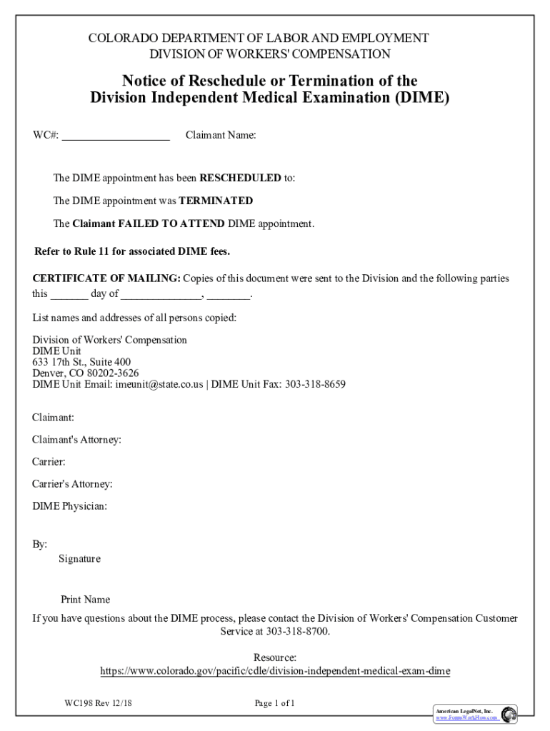 COLORADO DEPARTMENT OF LABOR AND EMPLOYMENT DIVISION OF WORKERS COMPENSATIONNotice of Reschedule or Termination of the Division Independent Medical Examination (DIME) WC#: Claimant Name:The DIME appointment