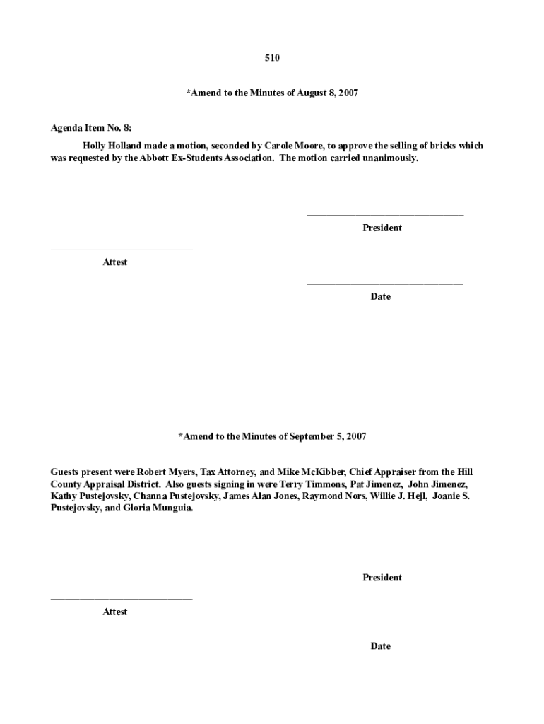 510 *Amend to the Minutes of August 8, 2007, Agenda Item No. 8: Holly Holland made a motion, seconded by Carole Moore, to approve the selling of bricks which was requested by the Abbott Students Association.