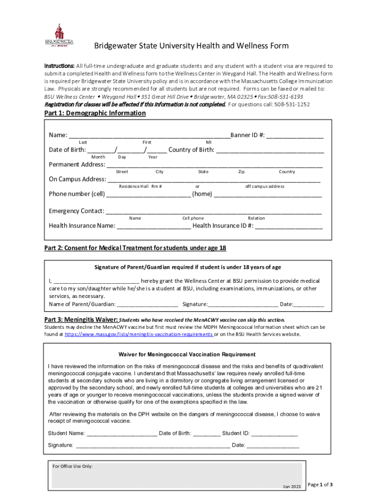 Get the free BSU Health and Wellness Form - Bridgewater State University