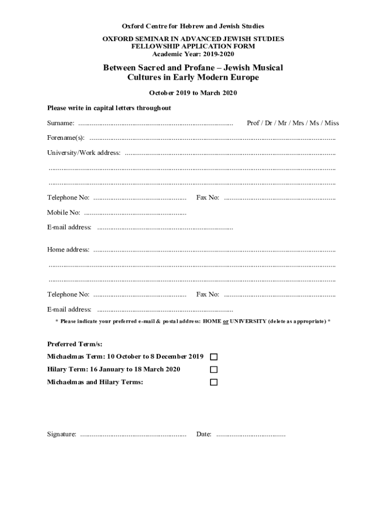 Oxford Center for Hebrew and Jewish Studies OXFORD SEMINAR IN ADVANCED JEWISH STUDIES FELLOWSHIP APPLICATION FORM Academic Year: 20192020Between Sacred and Profane Jewish Musical Cultures in Early