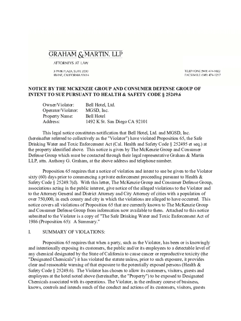 NOTICE BY THE McKenzie GROUP AND CONSUMER DEFENSE GROUP OF INTENT TO SUE PURSUANT TO HEALTH & SAFETY CODE 25249.6 Owner/Violator: Operator/Violator: Property Name: Address:Bell Hotel, Ltd. MGD, Inc.