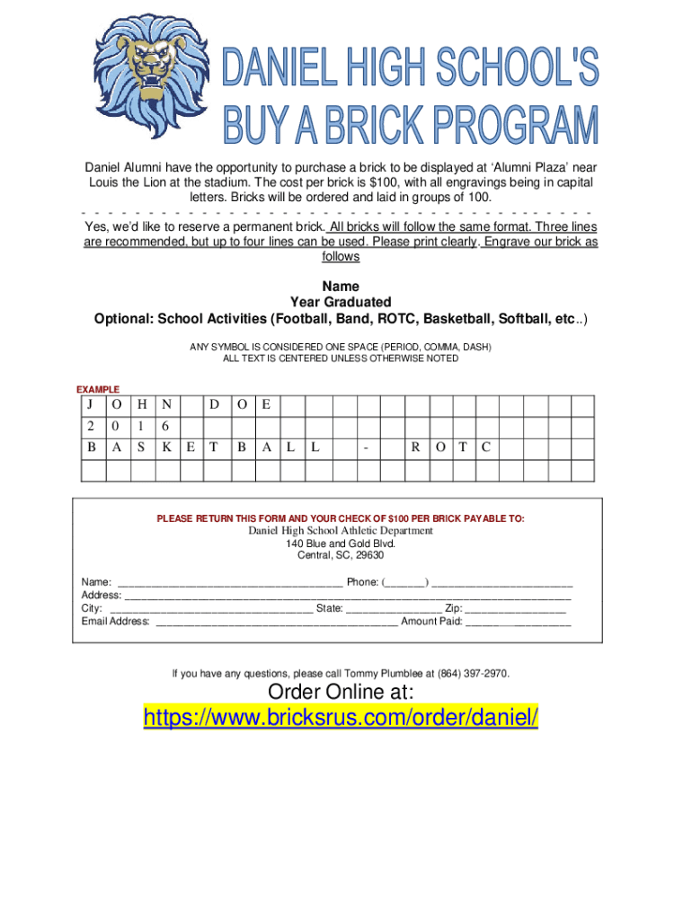 Daniel Alumni have the opportunity to purchase a brick to be displayed at Alumni Plaza near Louis the Lion at the stadium. The cost per brick is $100, with all engravings being in capital letters.