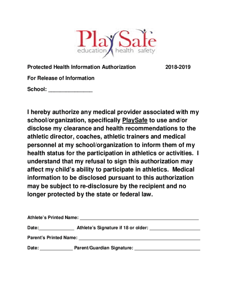 Protected Health Information Authorization20182019For Release of Information School: I hereby authorize any medical provider associated with my school/organization, specifically Playmate to use and/or