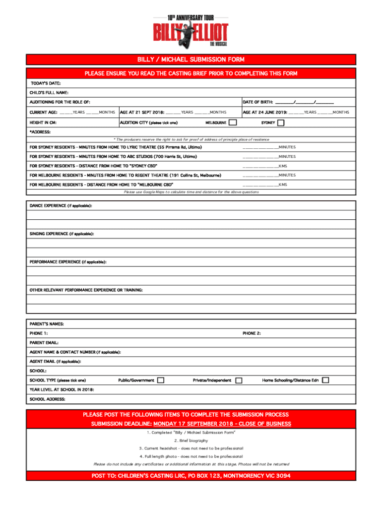 BILLY / MICHAEL SUBMISSION FORM PLEASE ENSURE YOU READ THE CASTING BRIEF PRIOR TO COMPLETING THIS FORM TODAY IS DATE: CHILD IS FULL NAME: AUDITIONING FOR THE ROLE OF:DATE OF BIRTH: / / CURRENT AGE: