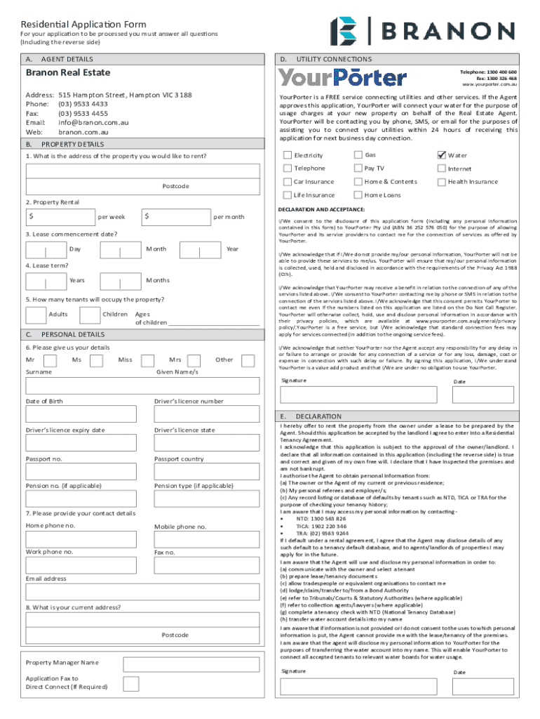 (Including the reverse side)A.AGENT DETAILS.UTILITY CONNECTIONSBranon Real EstateTelephone: 1300 400 600