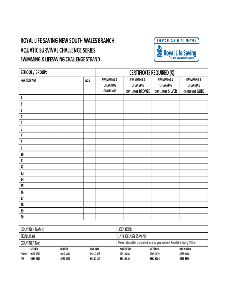 ROYAL LIFE SAVING NEW SOUTH WALES BRANCH AQUATIC SURVIVAL CHALLENGE SERIES SWIMMING & LIFESAVING CHALLENGE STRAND SCHOOL / GROUP:CERTIFICATE REQUIRED (X)PARTICIPANTSWIMMING & LIFESAVING CHALLENGEAGESWIMMING