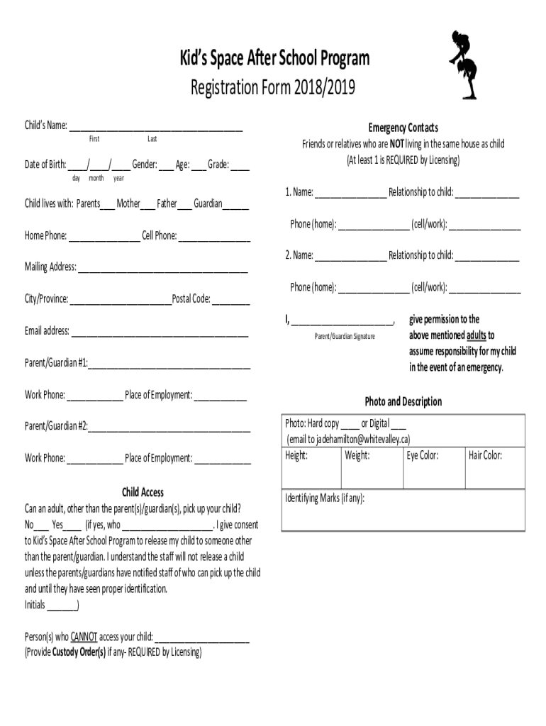 Kids Space After School Program Registration Form 2018/2019 Child's Name: FirstLastDate of Birth: / / Gender: Age: Grade: daymonthEmergency Contacts Friends or relatives who are NOT living in the