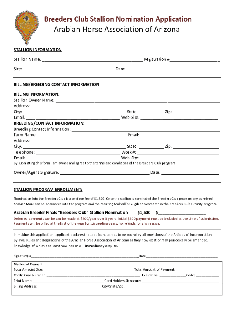 Breeders Club Stallion Nomination Application Arabian Horse Association of Arizona STALLION INFORMATION Stallion Name: Registration # Sire: Dam: BILLING/BREEDING CONTACT INFORMATION BILLING INFORMATION: