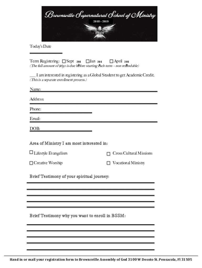Anyone who is required to register for BSSM (Bethel School of Supernatural Ministry) needs the BSSM registration form.docx. This form is typically used by students or individuals wishing to enroll in BSSM or participate in its programs and activities.