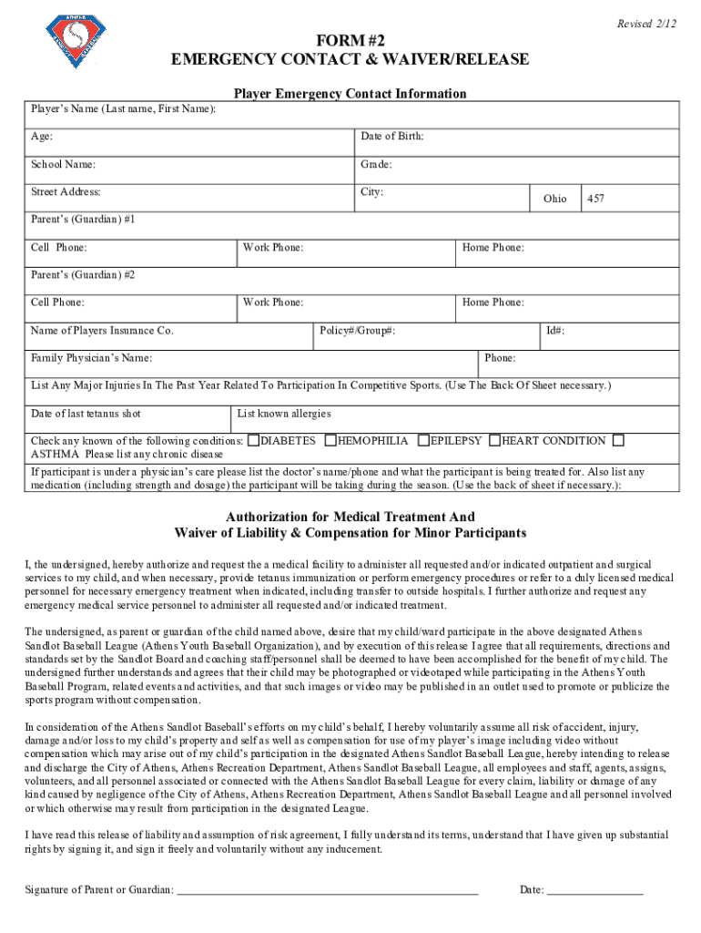 Revised 2/12FORM #2 EMERGENCY CONTACT & WAIVER/RELEASE Player Emergency Contact Information Players Name (Last name, First Name): Age:Date of Birth:School Name:Grade:Street Address:City:Ohio457Parents