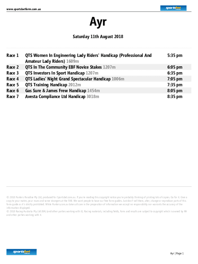 WWW.sportsbetform.com.away Saturday 11th August 2018Race 1 Race 2 Race 3 Race 4 Race 5 Race 6 Race 7QTS Women In Engineering Lady Riders Handicap (Professional And Amateur Lady Riders) 1609 m QTS