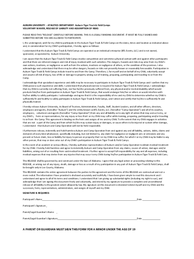 AUBURN UNIVERSITY ATHLETICS DEPARTMENT Auburn Tiger Track & Field Camps VOLUNTARY WAIVER, RELEASE OF LIABILITY AND ASSUMPTION OF RISKS PLEASE READ THIS RELEASE CAREFULLY BEFORE SIGNING. THIS IS A