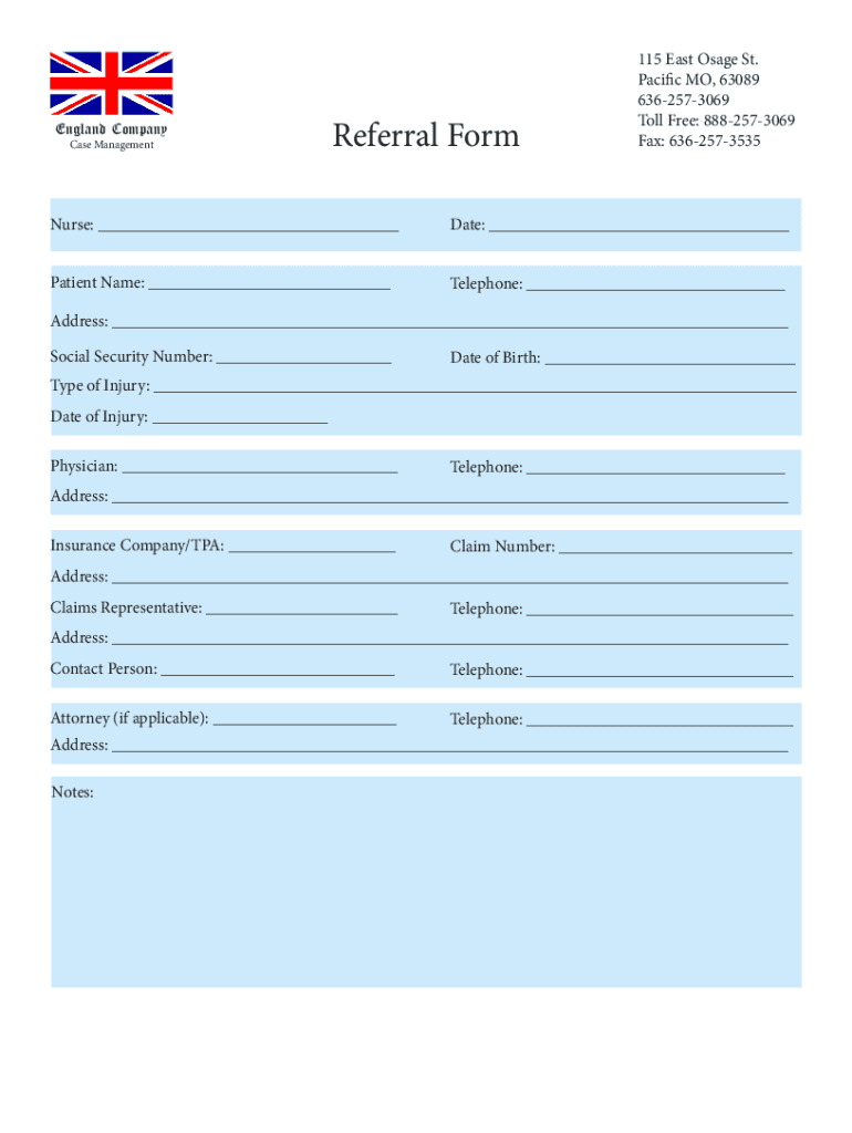 England Company Case ManagementReferral Form115 East Osage St. Pacific MO, 63089 6362573069 Toll Free: 8882573069 Fax: 6362573535Nurse: Date: Patient Name: Telephone: Address: Social Security Number: