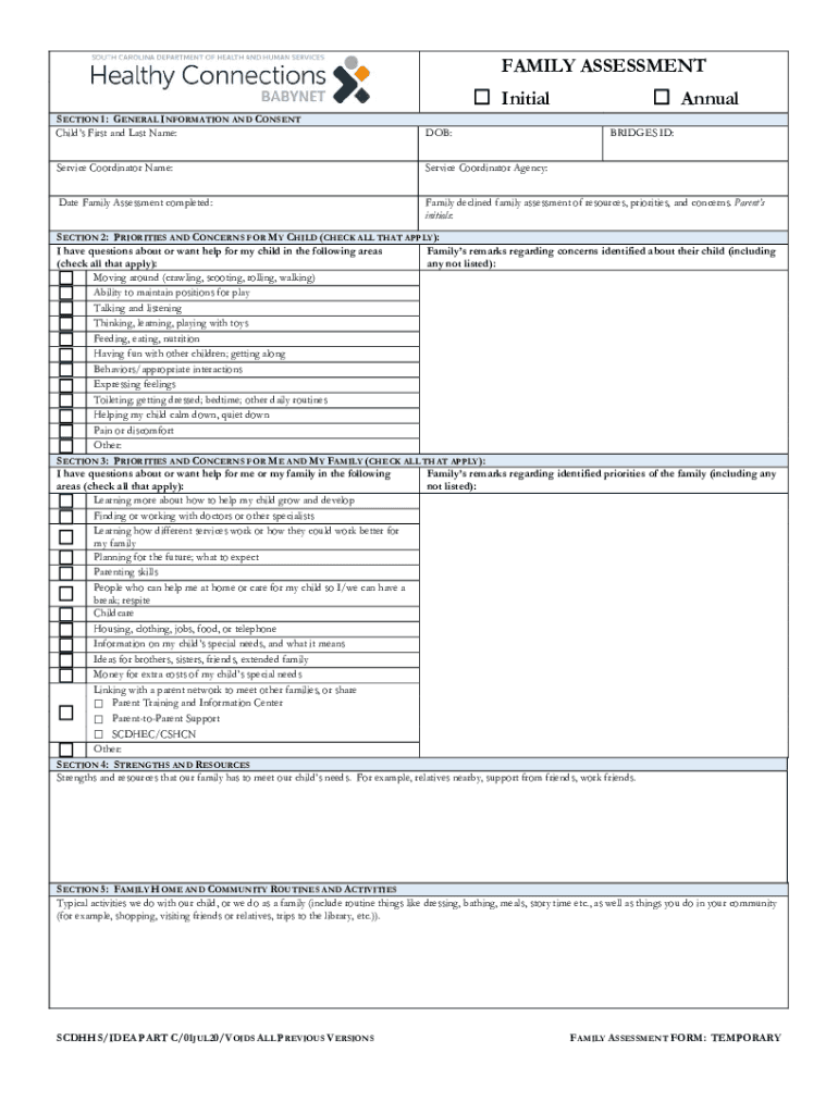 FAMILY ASSESSMENT Initial Annualization 1: GENERAL INFORMATION AND CONSENT Child's First and Last Name:DOB:Service Coordinator Name:Service Coordinator Agency:Date Family Assessment completed:Family
