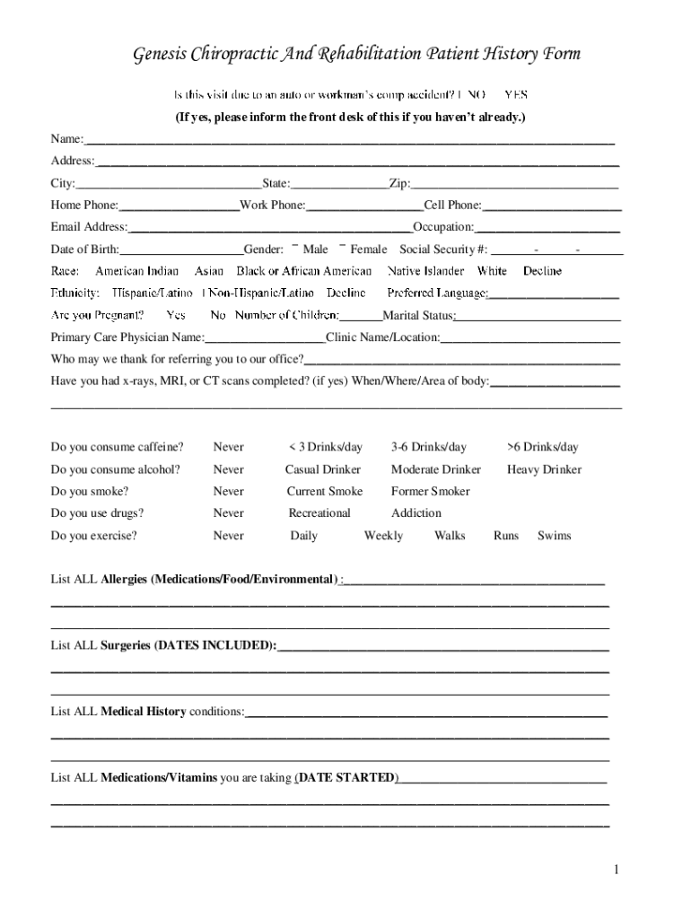 Genesis Chiropractic And Rehabilitation Patient History Form (If yes, please inform the front desk of this if you haven't already.) Name: Address: City: State: Zip: Home Phone: Work Phone: Cell Phone: