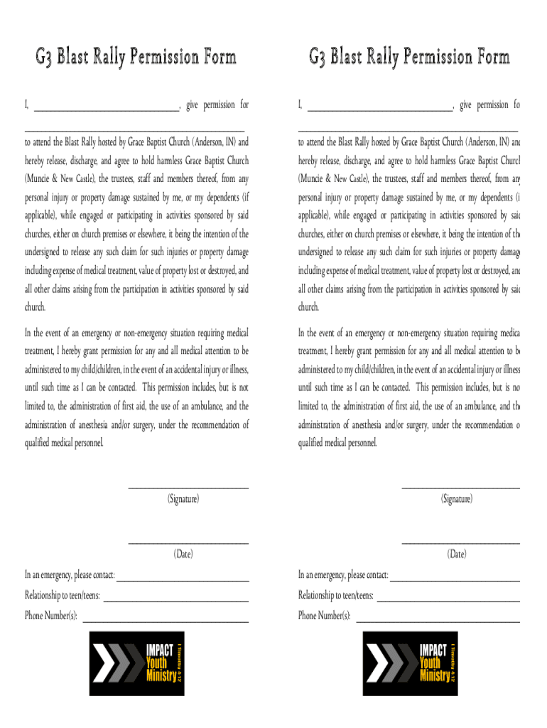 G3 Blast Rally Permission FormG3 Blast Rally Permission Form, give permission for to attend the Blast Rally hosted by Grace Baptist Church (Anderson, IN) and hereby release, discharge, and agree to