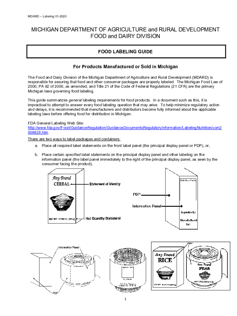 MDRD Labeling 012020MICHIGAN DEPARTMENT OF AGRICULTURE and RURAL DEVELOPMENT FOOD and DAIRY DIVISION FOOD LABELING GUIDE For Products Manufactured or Sold in Michigan The Food and Dairy Division of