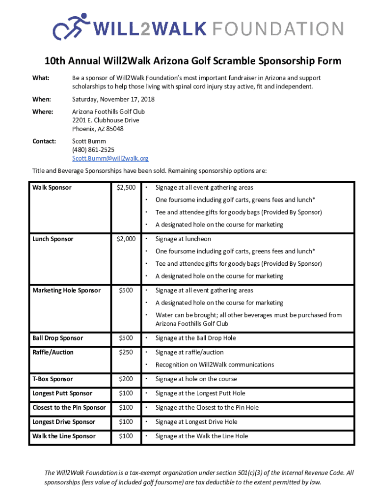10th Annual Will2Walk Arizona Golf Scramble Sponsorship Form