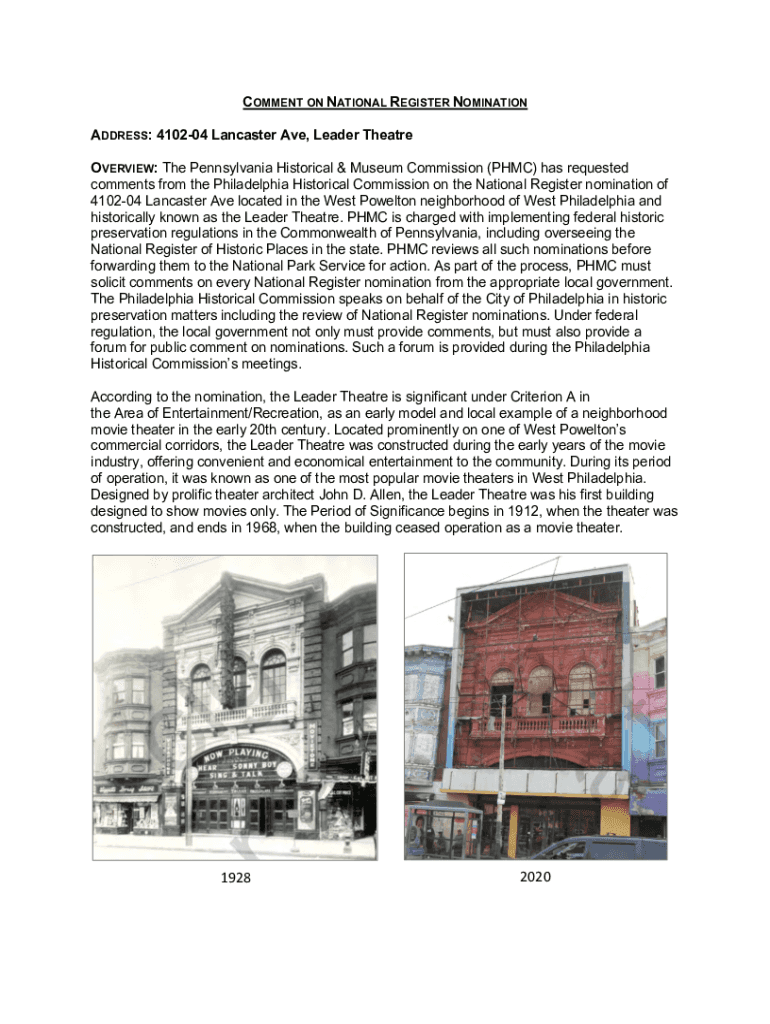 COMMENT ON NATIONAL REGISTER NOMINATION ADDRESS: 410204 Lancaster Ave, Leader Theater OVERVIEW: The Pennsylvania Historical & Museum Commission (HMC) has requested comments from the Philadelphia Historical