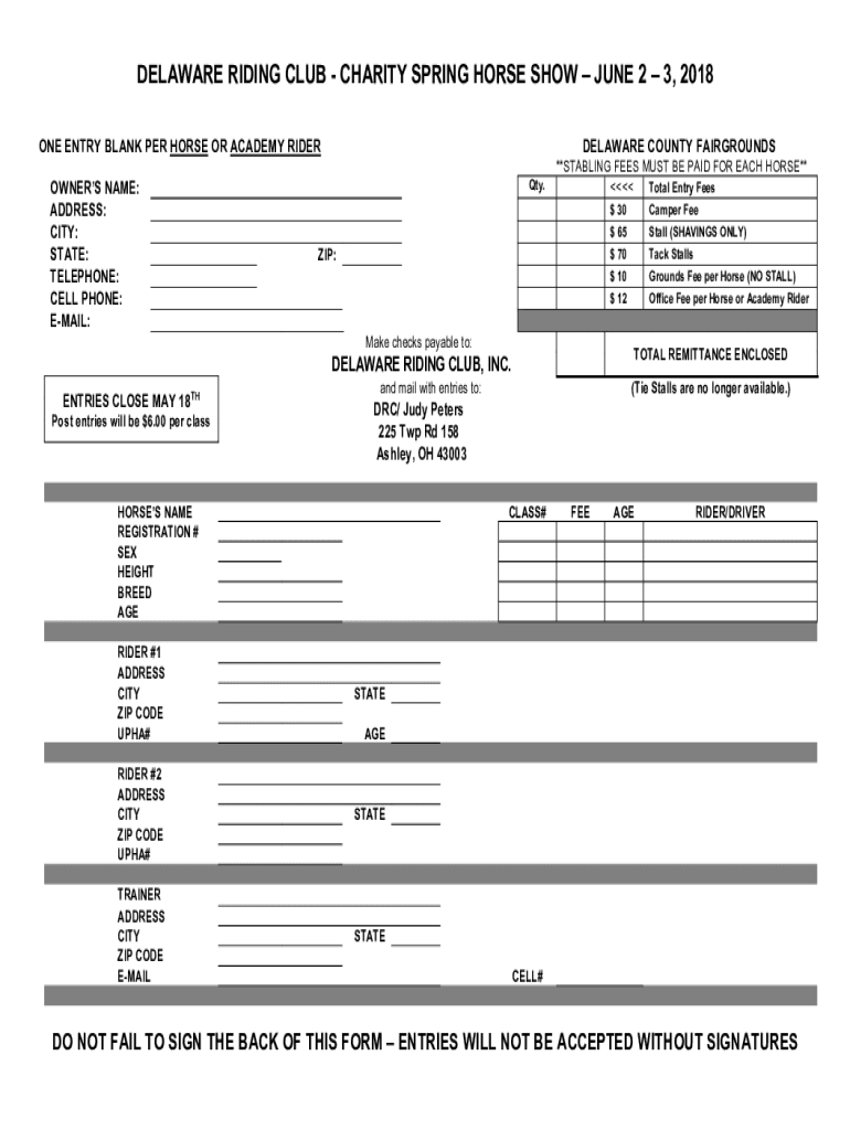 DELAWARE RIDING CLUB CHARITY SPRING HORSE SHOW JUNE 2 3, 2018 ONE ENTRY BLANK PER HORSE OR ACADEMY RIDER OWNERS NAME: ADDRESS: CITY: STATE: TELEPHONE: CELL PHONE: EMAIL:DELAWARE COUNTY FAIRGROUNDS