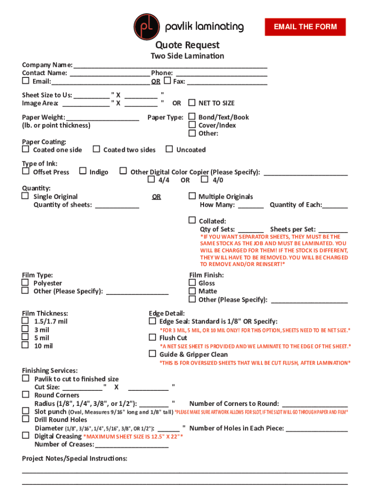 Get the free Quote Request - Pavlik Laminating Film Laminating in ...