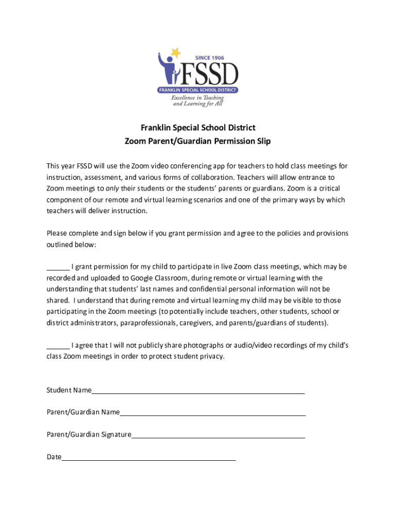 Parents or guardians of students who wish to allow their children to participate in Zoom meetings must file the fssd zoom permission slipdocx.