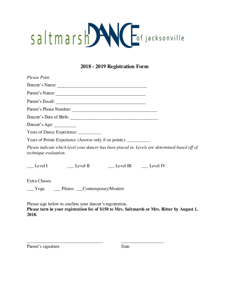 2018 2019 Registration Form Please Print. Dancers Name: Parents Name: Parents Email: Parents Phone Number: Dancers Date of Birth: Dancers Age: Years of Dance Experience: Years of Point Experience
