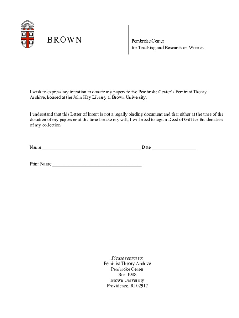 BROWN Pembroke Center for Teaching and Research on Women wish to express my intention to donate my papers to the Pembroke Centers Feminist Theory Archive, housed at the John Hay Library at Brown University.