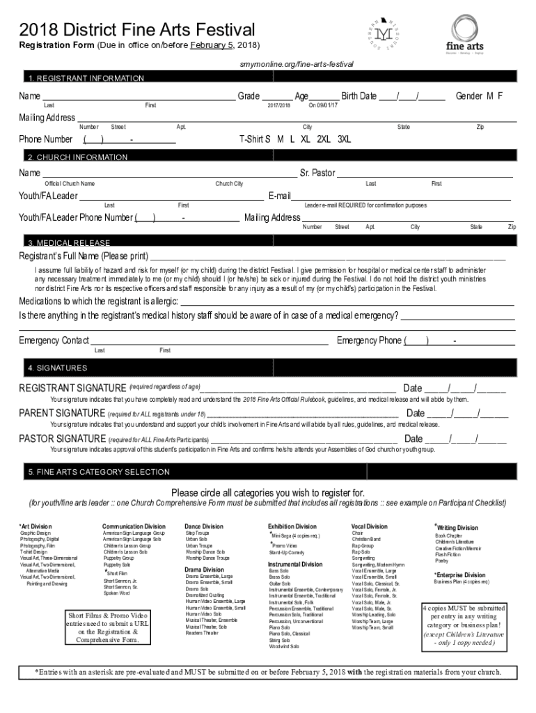 2018 District Fine Arts FestivalRegistration Form (Due in office on/before February 5, 2018) smymonline.org/fineartsfestival 1. REGISTRANT Informational Grade Age Birth Date / / LastFirstGender M