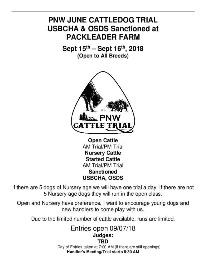 PNW JUNE CATTLE TRIAL SACHA & ODDS Sanctioned at BANDLEADER FARM Sept 15th Sept 16th, 2018 (Open to All Breeds)Open Cattle AM Trial/PM Trial Nursery Cattle Started Cattle AM Trial/PM Trial Sanctioned