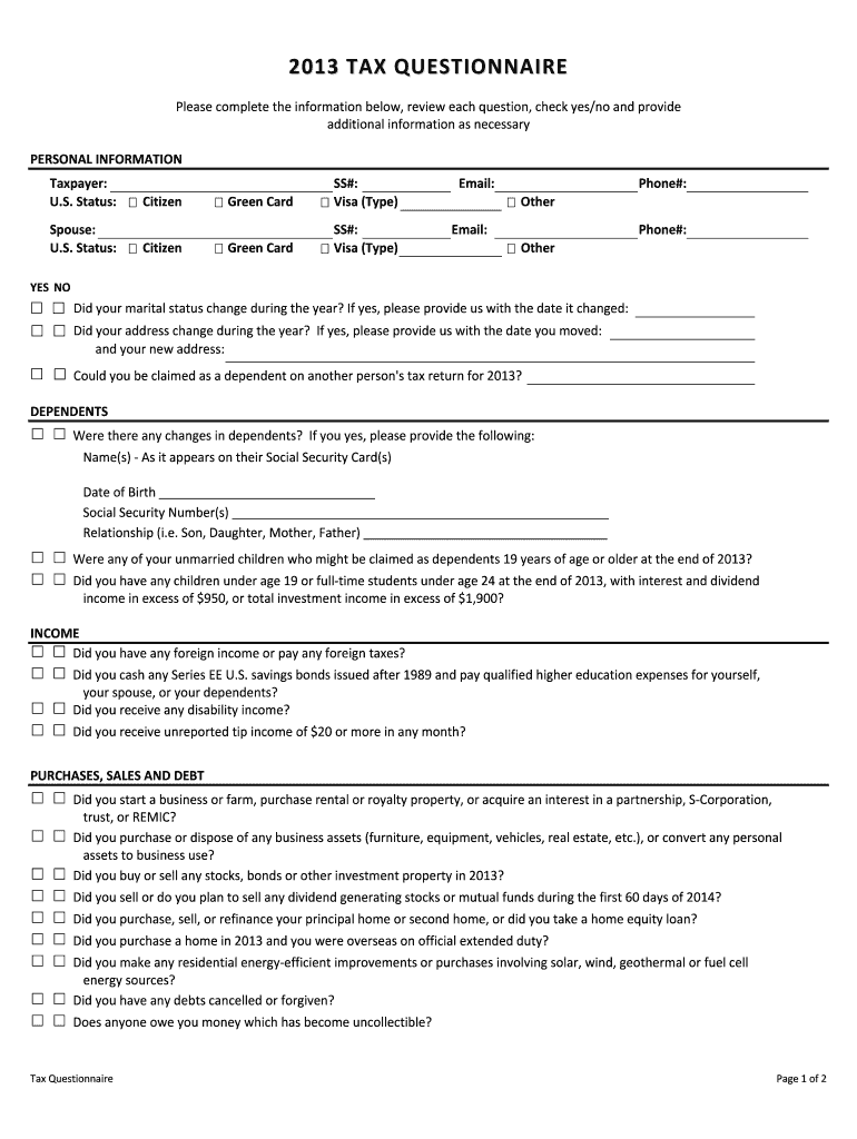 2013TAXQUESTIONNAIRE Pleasecompletetheinformationbelow, revieweachquestion, check yes/noandprovide additionalinformationasnecessary PERSONALINFORMATION Taxpayer: U.S. Status: Citizen Greenland SS#: