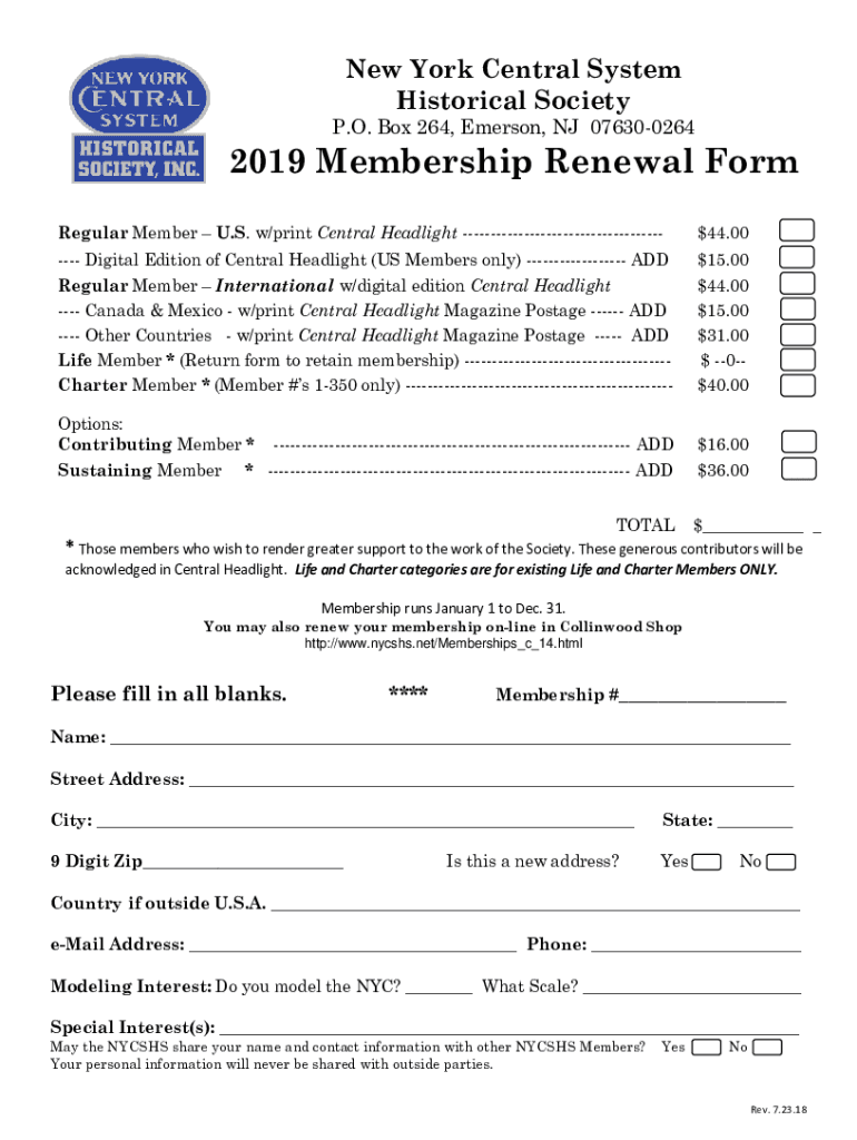 New York Central System Historical Society P.O. Box 264, Emerson, NJ 0763002642019 Membership Renewal Form Regular Member U.S. w/print Central Headlight $44.00 Digital Edition of Central Headlight