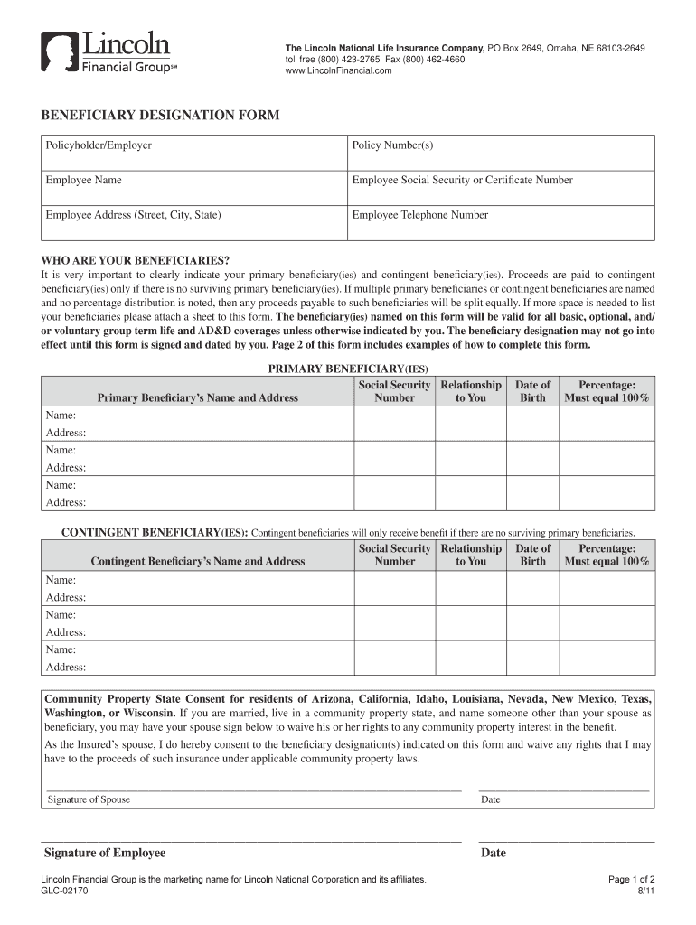 Employees planning to designate beneficiaries for their life insurance should fill out this form. Additionally, spouses may need to co-sign if applicable.