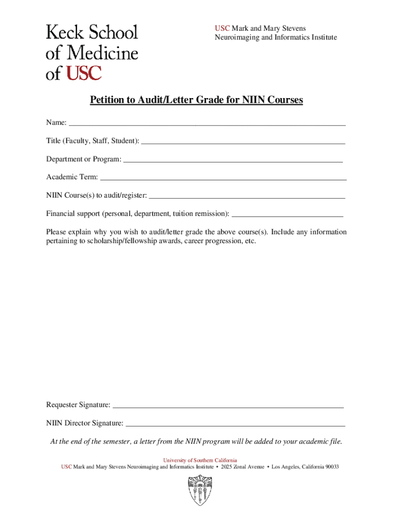 USC Mark and Mary Stevens Neuroimaging and Informatics InstitutePetition to Audit/Letter Grade for IIN Courses Name: Title (Faculty, Staff, Student): Department or Program: Academic Term: IIN Course(s)