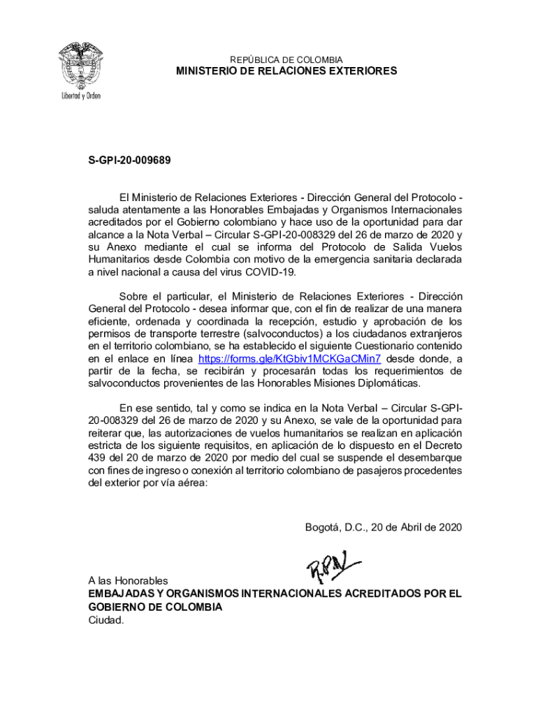 REPLICA DE COLOMBIAMINISTERIO DE RELATIONS EXTERIORESSGPI20009689 El Minister de Relaciones Exteriors Direction General Del Protocol Saudi testament a leis Honorable Bajadas y Organisms Internationals