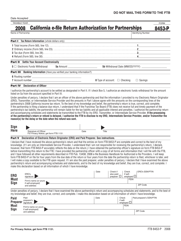 DO NOT MAIL THIS FORM TO THE FT Date Accepted TAXABLE YEAR FORM 2008 California e-file Return Authorization for Partnerships Name of Partnership Identifying Number 8453-P Part I? Tax Return Information