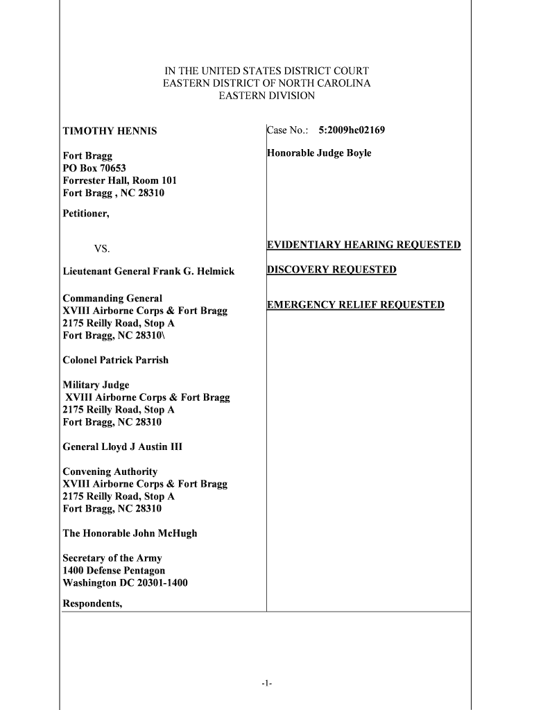 IN THE UNITED STATES DISTRICT COURT EASTERN DISTRICT OF NORTH CAROLINA EASTERN DIVISION TIMOTHY TENNIS Case No.: 5:2009hc02169 Fort Bragg PO Box 70653 Forrester Hall, Room 101 Fort Bragg, NC 28310