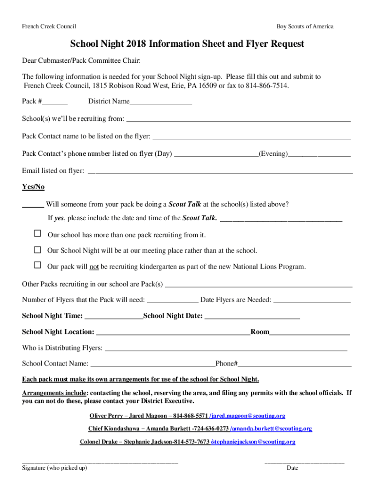 French Creek Councilor Scouts of AmericaSchool Night 2018 Information Sheet and Flyer Request Dear Cub master/Pack Committee Chair: The following information is needed for your School Night sign up.