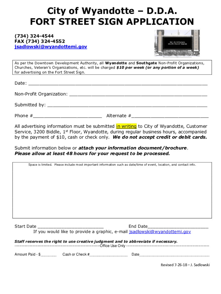 City of Wyandotte D.D.A. FORT STREET SIGN APPLICATION (734) 3244544 FAX (734) 3244552 jsadlowski Wyandotte. Novas per the Downtown Development Authority, all Wyandotte and Southgate Nonprofit Organizations,