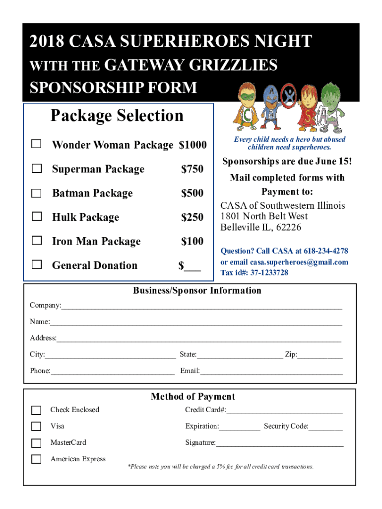 2018 CASA SUPERHEROES NIGHT WITH THE GATEWAY GRIZZLIESSPONSORSHIP Repackage Selection Wonder Woman Package $1000 Superman Package$750Batman Package$500Hulk Package$250Iron Man Package$100General Donation